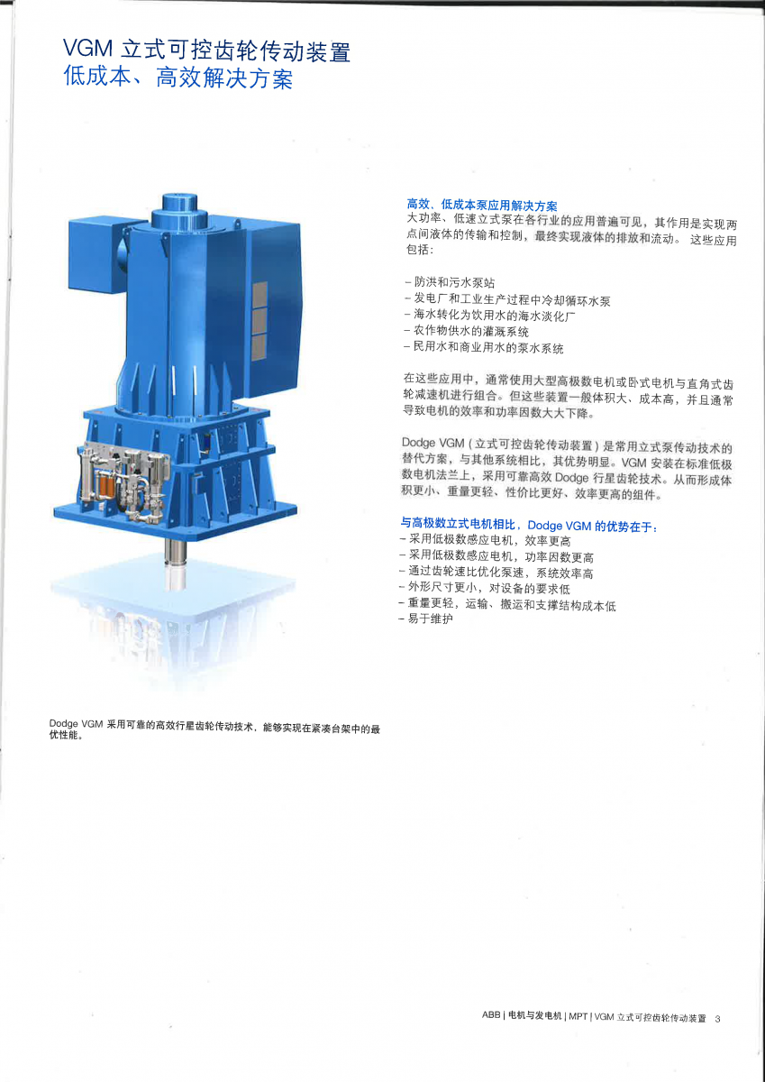 VGM立式可控齿轮传动装置是常用立式泵传动技术的替代方案,与其他系统相比,其优势明显。VGM安装在标准低级数电机法兰哈桑,采用可靠高校Dodge行星齿轮技术,从而形成体积更小,重量更轻,性价比更好,效率更高的组件。